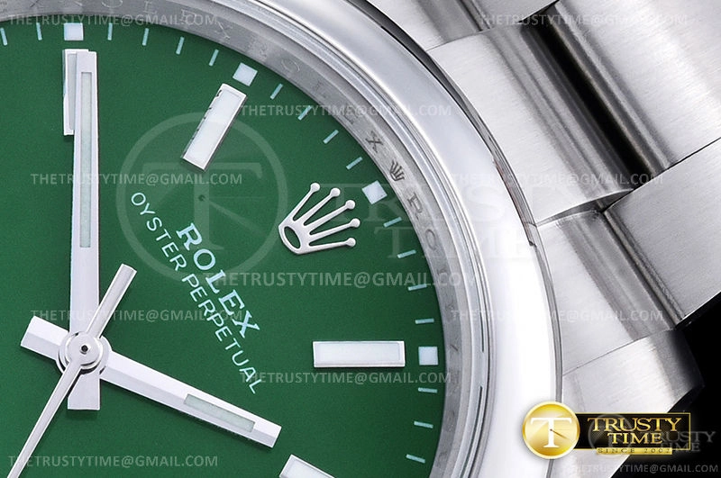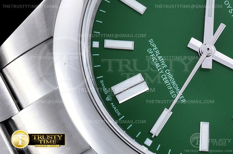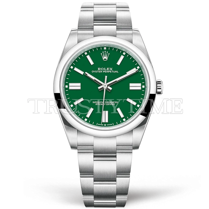 Часы Rolex из коллекции Oyster Perpetual. Классические мужские часы Rolex Oyster Perpetual 41mm 124300-0005 премиального качества (Артикул магазина: RX-1735) оснащены надежным автоматическим механизмом с автоподзаводом (работает от амплитуды движения руки) калибра 3230, в котором реализованы следующие функции: часовая, минутная и секундная стрелки, а так же максимально простой функционал без усложнений. Круглый корпус часов стального цвета, имеющий размер 41 мм и высоту 12 мм превосходно дополнит образ и украсит запястье своего обладателя. Для изготовления часов Rolex Oyster Perpetual 41mm 124300-0005 предлагаемых в нашем интернет-магазине, применяются нержавеющая сталь 904L высокого качества (Швейцарский стандарт), а так же сапфировое стекло высокой прочности, благодаря чему обеспечивается максимальная защита от сколов и механических повреждений. Отличительной чертой данной модели является зеленый циферблат, часовые индексы которого обеспечивают часовые метки. Завершает образ браслет из нержавеющей стали стального цвета с фирменной раскладывающейся застежкой Rolex. Водонепроницаемость данной модели составляет 30М (WR30) – допускается минимальное воздействие с водой.
