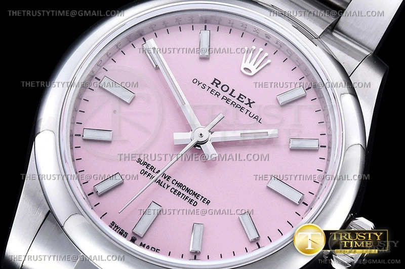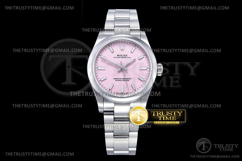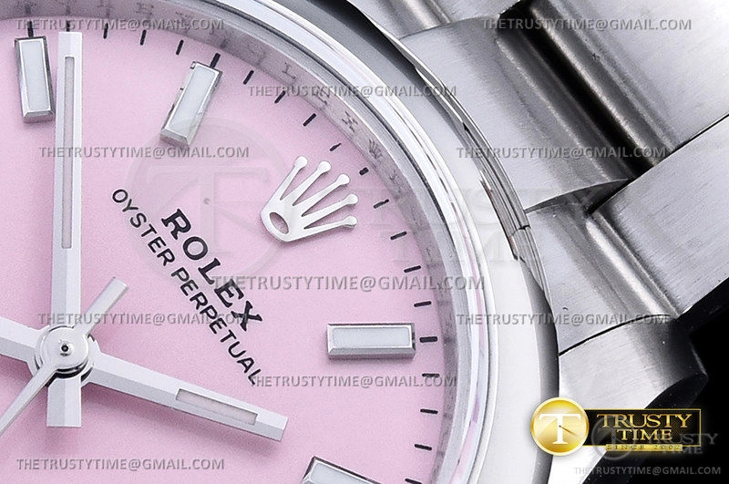 Часы Rolex из коллекции Oyster Perpetual. Классические женские часы Rolex Oyster Perpetual 31mm 277200-0004 премиального качества (Артикул магазина: RX-1802) оснащены надежным автоматическим механизмом с автоподзаводом (работает от амплитуды движения руки) калибра MY6T15, в котором реализованы следующие функции: часовая, минутная и секундная стрелки, а так же максимально простой функционал без усложнений. Круглый корпус часов стального цвета, имеющий размер 31 мм и высоту 11 мм превосходно дополнит образ и украсит запястье своего обладателя. Для изготовления часов Rolex Oyster Perpetual 31mm 277200-0004 предлагаемых в нашем интернет-магазине, применяются нержавеющая сталь 316F высокого качества (Швейцарский стандарт), а так же сапфировое стекло высокой прочности, благодаря чему обеспечивается максимальная защита от сколов и механических повреждений. Отличительной чертой данной модели является розовый циферблат, часовые индексы которого обеспечивают часовые метки. Завершает образ браслет из нержавеющей стали стального цвета с фирменной раскладывающейся застежкой Rolex. Водонепроницаемость данной модели составляет 30М (WR30) – допускается минимальное воздействие с водой.