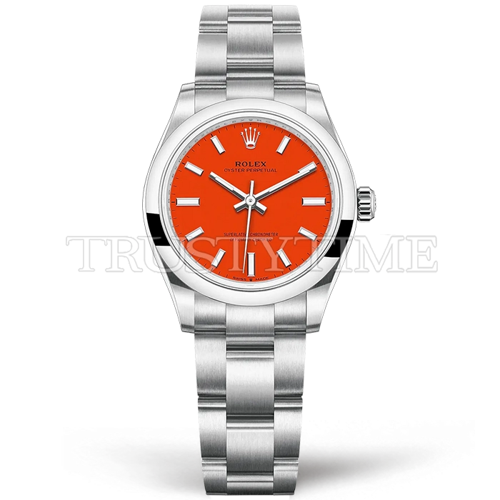Часы Rolex из коллекции Oyster Perpetual. Классические женские часы Rolex Oyster Perpetual 31mm 277200-0008 премиального качества (Артикул магазина: RX-1805) оснащены надежным автоматическим механизмом с автоподзаводом (работает от амплитуды движения руки) калибра MY6T15, в котором реализованы следующие функции: часовая, минутная и секундная стрелки, а так же максимально простой функционал без усложнений. Круглый корпус часов стального цвета, имеющий размер 31 мм и высоту 11 мм превосходно дополнит образ и украсит запястье своего обладателя. Для изготовления часов Rolex Oyster Perpetual 31mm 277200-0008 предлагаемых в нашем интернет-магазине, применяются нержавеющая сталь 316F высокого качества (Швейцарский стандарт), а так же сапфировое стекло высокой прочности, благодаря чему обеспечивается максимальная защита от сколов и механических повреждений. Отличительной чертой данной модели является красный циферблат, часовые индексы которого обеспечивают часовые метки. Завершает образ браслет из нержавеющей стали стального цвета с фирменной раскладывающейся застежкой Rolex. Водонепроницаемость данной модели составляет 30М (WR30) – допускается минимальное воздействие с водой.