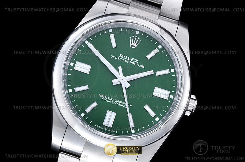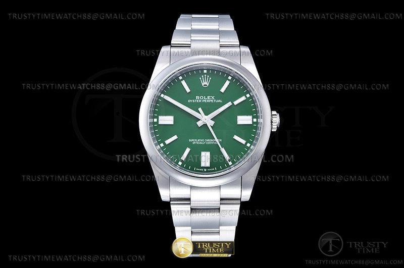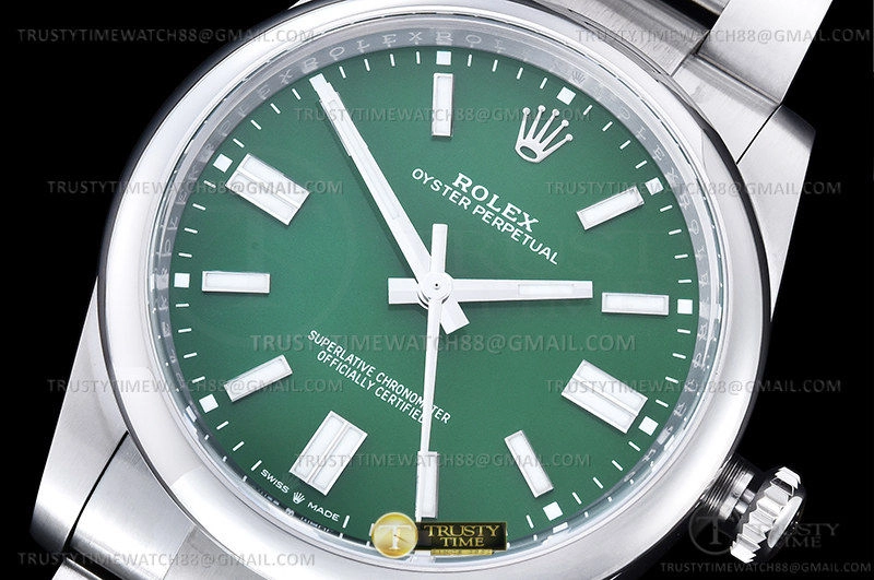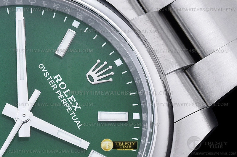 Часы Rolex из коллекции Oyster Perpetual. Классические женские часы Rolex Oyster Perpetual 36mm 126000-0005 премиального качества (Артикул магазина: RX-1863) оснащены надежным автоматическим механизмом с автоподзаводом (работает от амплитуды движения руки) калибра 3230, в котором реализованы следующие функции: часовая, минутная и секундная стрелки, а так же максимально простой функционал без усложнений. Круглый корпус часов стального цвета, имеющий размер 36 мм и высоту 12 мм превосходно дополнит образ и украсит запястье своего обладателя. Для изготовления часов Rolex Oyster Perpetual 36mm 126000-0005 предлагаемых в нашем интернет-магазине, применяются нержавеющая сталь 904L высокого качества (Швейцарский стандарт), а так же сапфировое стекло высокой прочности, благодаря чему обеспечивается максимальная защита от сколов и механических повреждений. Отличительной чертой данной модели является зеленый циферблат, часовые индексы которого обеспечивают часовые метки. Завершает образ браслет из нержавеющей стали стального цвета с фирменной раскладывающейся застежкой Rolex. Водонепроницаемость данной модели составляет 30М (WR30) – допускается минимальное воздействие с водой.