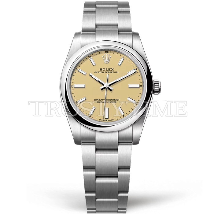 Часы Rolex из коллекции Oyster Perpetual. Классические женские часы Rolex Oyster Perpetual 34mm 124200-0007 премиального качества (Артикул магазина: RX-3577) оснащены надежным автоматическим механизмом с автоподзаводом (работает от амплитуды движения руки) калибра 3130, в котором реализованы следующие функции: часовая, минутная и секундная стрелки, а так же максимально простой функционал без усложнений. Круглый корпус часов стального цвета, имеющий размер 34 мм и высоту 11 мм превосходно дополнит образ и украсит запястье своего обладателя. Для изготовления часов Rolex Oyster Perpetual 34mm 124200-0007 предлагаемых в нашем интернет-магазине, применяются нержавеющая сталь 904L высокого качества (Швейцарский стандарт), а так же сапфировое стекло высокой прочности, благодаря чему обеспечивается максимальная защита от сколов и механических повреждений. Отличительной чертой данной модели является желтый циферблат, часовые индексы которого обеспечивают часовые метки. Завершает образ браслет из нержавеющей стали стального цвета с фирменной раскладывающейся застежкой Rolex. Водонепроницаемость данной модели составляет 30М (WR30) – допускается минимальное воздействие с водой.