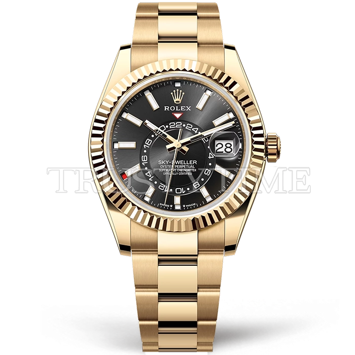 Часы Rolex из коллекции Sky-Dweller. Классические мужские часы Rolex Sky-Dweller 42mm 326938-0002 премиального качества (Артикул магазина: RX-2832) оснащены надежным автоматическим механизмом с автоподзаводом (работает от амплитуды движения руки) калибра 9002, в котором реализованы следующие функции: часовая, минутная и секундная стрелки, а так же дата, двойное время (GMT), месяц. Круглый корпус часов цветы желтой золота, имеющий размер 42 мм и высоту 15 мм превосходно дополнит образ и украсит запястье своего обладателя. Для изготовления часов Rolex Sky-Dweller 42mm 326938-0002 предлагаемых в нашем интернет-магазине, применяются нержавеющая сталь 316F высокого качества (Швейцарский стандарт), а так же сапфировое стекло высокой прочности, благодаря чему обеспечивается максимальная защита от сколов и механических повреждений. Отличительной чертой данной модели является черный циферблат, часовые индексы которого обеспечивают часовые метки. Завершает образ браслет из нержавеющей стали цвета желтого золота с фирменной раскладывающейся застежкой Rolex. Водонепроницаемость данной модели составляет 30М (WR30) – допускается минимальное воздействие с водой.