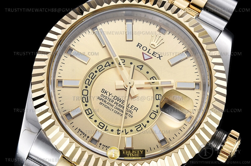Часы Rolex из коллекции Sky-Dweller. Классические мужские часы Rolex Sky-Dweller 42mm 326933-0001 премиального качества (Артикул магазина: RX-1748) оснащены надежным автоматическим механизмом с автоподзаводом (работает от амплитуды движения руки) калибра 9002, в котором реализованы следующие функции: часовая, минутная и секундная стрелки, а так же дата, двойное время (GMT), месяц. Круглый корпус часов комбинированного сталь с желтого золота цвета, имеющий размер 42 мм и высоту 15 мм превосходно дополнит образ и украсит запястье своего обладателя. Для изготовления часов Rolex Sky-Dweller 42mm 326933-0001 предлагаемых в нашем интернет-магазине, применяются нержавеющая сталь 316F высокого качества (Швейцарский стандарт), а так же сапфировое стекло высокой прочности, благодаря чему обеспечивается максимальная защита от сколов и механических повреждений. Отличительной чертой данной модели является золотой циферблат, часовые индексы которого обеспечивают часовые метки. Завершает образ браслет из нержавеющей стали комбинированного сталь с желтым золотом цвета с фирменной раскладывающейся застежкой Rolex. Водонепроницаемость данной модели составляет 30М (WR30) – допускается минимальное воздействие с водой.