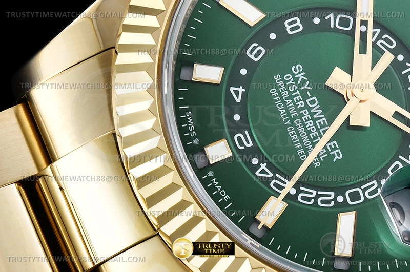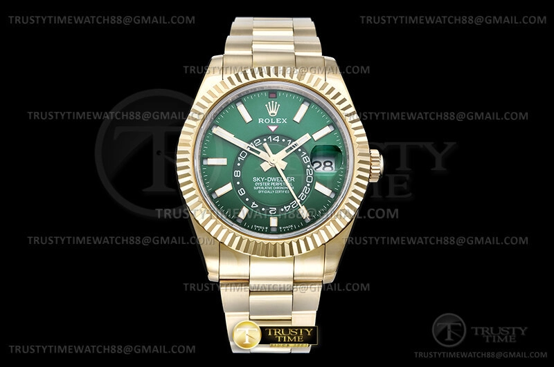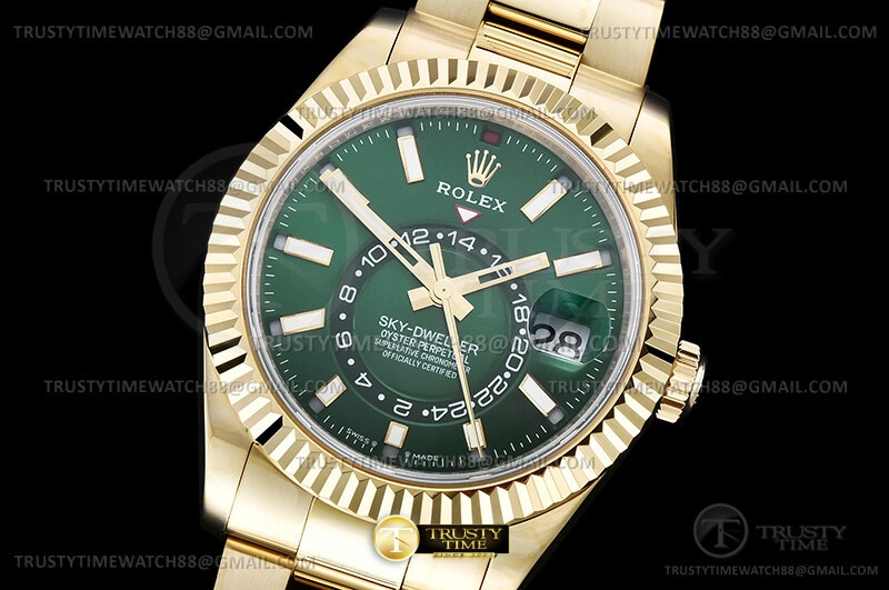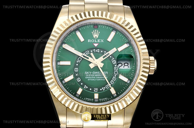 Часы Rolex из коллекции Sky Dweller. Классические мужские часы Rolex Sky-Dweller 42mm 336938-0007 премиального качества (Артикул магазина: RX-3522) оснащены надежным автоматическим механизмом с автоподзаводом (работает от амплитуды движения руки) калибра 9001, в котором реализованы следующие функции: часовая, минутная и секундная стрелки, а так же дата, двойное время (GMT), месяц. Круглый корпус часов цветы желтой золота, имеющий размер 42 мм и высоту 15 мм превосходно дополнит образ и украсит запястье своего обладателя. Для изготовления часов Rolex Sky-Dweller 42mm 336938-0007 предлагаемых в нашем интернет-магазине, применяются нержавеющая сталь 904L высокого качества (Швейцарский стандарт), а так же сапфировое стекло высокой прочности, благодаря чему обеспечивается максимальная защита от сколов и механических повреждений. Отличительной чертой данной модели является зеленый циферблат, часовые индексы которого обеспечивают часовые метки. Завершает образ браслет из нержавеющей стали цвета желтого золота с фирменной раскладывающейся застежкой Rolex. Водонепроницаемость данной модели составляет 30М (WR30) – допускается минимальное воздействие с водой.