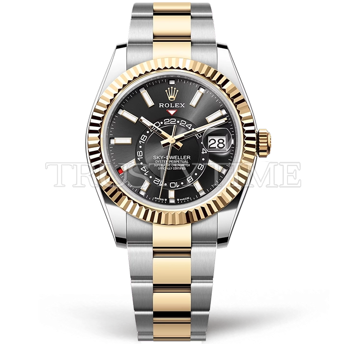 Часы Rolex из коллекции Sky-Dweller. Классические мужские часы Rolex Sky-Dweller 42mm 326933-0003 премиального качества (Артикул магазина: RX-2827) оснащены надежным автоматическим механизмом с автоподзаводом (работает от амплитуды движения руки) калибра 9002, в котором реализованы следующие функции: часовая, минутная и секундная стрелки, а так же дата, двойное время (GMT), месяц. Круглый корпус часов комбинированного сталь с желтого золота цвета, имеющий размер 42 мм и высоту 15 мм превосходно дополнит образ и украсит запястье своего обладателя. Для изготовления часов Rolex Sky-Dweller 42mm 326933-0003 предлагаемых в нашем интернет-магазине, применяются нержавеющая сталь 316F высокого качества (Швейцарский стандарт), а так же сапфировое стекло высокой прочности, благодаря чему обеспечивается максимальная защита от сколов и механических повреждений. Отличительной чертой данной модели является черный циферблат, часовые индексы которого обеспечивают часовые метки. Завершает образ браслет из нержавеющей стали комбинированного сталь с желтым золотом цвета с фирменной раскладывающейся застежкой Rolex. Водонепроницаемость данной модели составляет 30М (WR30) – допускается минимальное воздействие с водой.
