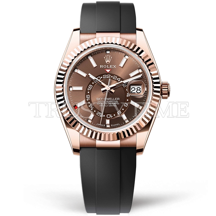 Часы Rolex из коллекции Sky Dweller. Классические мужские часы Rolex Sky-Dweller 42mm 336235-0002 премиального качества (Артикул магазина: RX-2895) оснащены надежным автоматическим механизмом с автоподзаводом (работает от амплитуды движения руки) калибра 9002, в котором реализованы следующие функции: часовая, минутная и секундная стрелки, а так же дата, двойное время (GMT), месяц. Круглый корпус часов розового цвета, имеющий размер 42 мм и высоту 15 мм превосходно дополнит образ и украсит запястье своего обладателя. Для изготовления часов Rolex Sky-Dweller 42mm 336235-0002 предлагаемых в нашем интернет-магазине, применяются нержавеющая сталь 316F высокого качества (Швейцарский стандарт), а так же сапфировое стекло высокой прочности, благодаря чему обеспечивается максимальная защита от сколов и механических повреждений. Отличительной чертой данной модели является коричневый циферблат, часовые индексы которого обеспечивают часовые метки. Завершает образ каучуковый ремешок черного цвета с фирменной раскладывающейся застежкой Rolex. Водонепроницаемость данной модели составляет 30М (WR30) – допускается минимальное воздействие с водой.