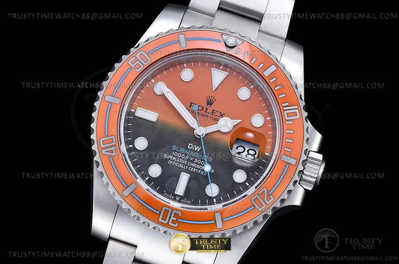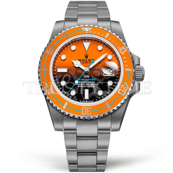 Часы Rolex из коллекции Submariner DiW. Классические мужские часы Rolex Submariner DiW 41mm Persimmon премиального качества (Артикул магазина: RX-2851) оснащены надежным автоматическим механизмом с автоподзаводом (работает от амплитуды движения руки) калибра 3135, в котором реализованы следующие функции: часовая, минутная и секундная стрелки, а так же дата. Круглый корпус часов серого цвета, имеющий размер 41 мм и высоту 13 мм превосходно дополнит образ и украсит запястье своего обладателя. Для изготовления часов Rolex Submariner DiW 41mm Persimmon предлагаемых в нашем интернет-магазине, применяются нержавеющая сталь 904L высокого качества (Швейцарский стандарт), а так же сапфировое стекло высокой прочности, благодаря чему обеспечивается максимальная защита от сколов и механических повреждений. Отличительной чертой данной модели является оранжевый циферблат, часовые индексы которого обеспечивают часовые метки. Завершает образ браслет из нержавеющей стали серого цвета с фирменной раскладывающейся застежкой Rolex. Водонепроницаемость данной модели составляет 30М (WR30) – допускается минимальное воздействие с водой.
