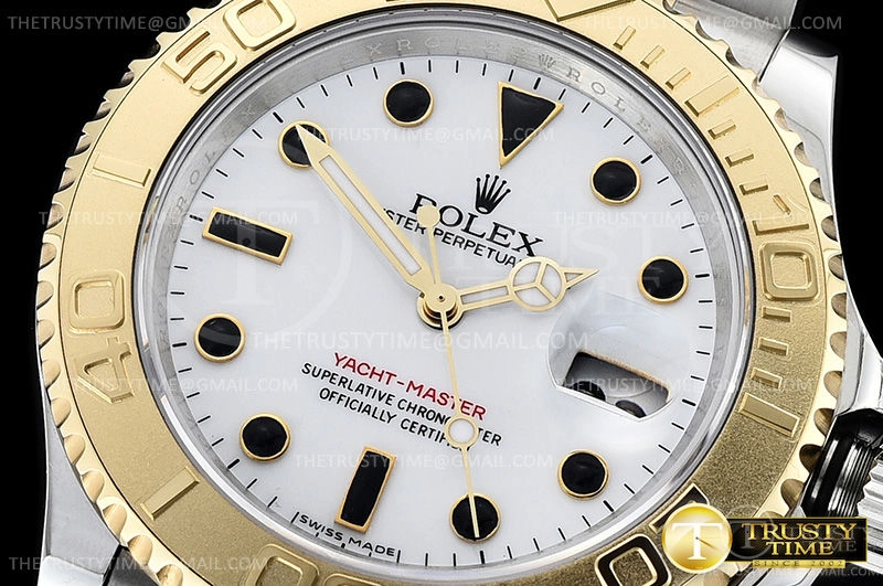 Часы Rolex из коллекции Yacht-Master. Классические мужские часы Rolex Yacht-Master 40mm 16623-0006 премиального качества (Артикул магазина: RX-1564) оснащены надежным автоматическим механизмом с автоподзаводом (работает от амплитуды движения руки) калибра 3135, в котором реализованы следующие функции: часовая, минутная и секундная стрелки, а так же дата. Круглый корпус часов комбинированного сталь с желтого золота цвета, имеющий размер 40 мм и высоту 12.5 мм превосходно дополнит образ и украсит запястье своего обладателя. Для изготовления часов Rolex Yacht-Master 40mm 16623-0006 предлагаемых в нашем интернет-магазине, применяются нержавеющая сталь 904L высокого качества (Швейцарский стандарт), а так же сапфировое стекло высокой прочности, благодаря чему обеспечивается максимальная защита от сколов и механических повреждений. Отличительной чертой данной модели является белый циферблат, часовые индексы которого обеспечивают часовые метки. Завершает образ браслет из нержавеющей стали комбинированного сталь с желтым золотом цвета с фирменной раскладывающейся застежкой Rolex. Водонепроницаемость данной модели составляет 30М (WR30) – допускается минимальное воздействие с водой.