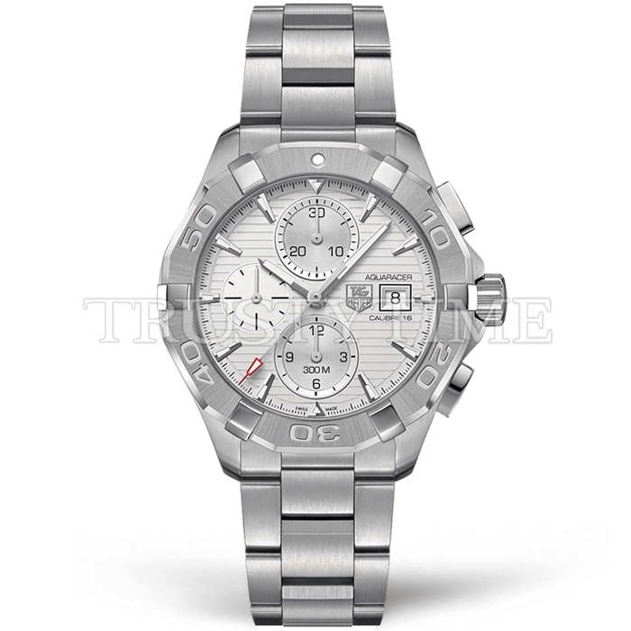Часы Tag Heuer из коллекции Aquaracer Calibre 16. Спортивные мужские часы Tag Heuer Aquaracer 300M Calibre 16 43mm CAY2111.BA0927 премиального качества (Артикул магазина: TG-0565) оснащены надежным автоматическим механизмом с автоподзаводом (работает от амплитуды движения руки) калибра Valjoux-7750, в котором реализованы следующие функции: часовая, минутная и секундная стрелки, а так же хронограф, дата. Круглый корпус часов стального цвета, имеющий размер 43 мм и высоту 14.5 мм превосходно дополнит образ и украсит запястье своего обладателя. Для изготовления часов Tag Heuer Aquaracer 300M Calibre 16 43mm CAY2111.BA0927 предлагаемых в нашем интернет-магазине, применяются нержавеющая сталь 316L высокого качества (Швейцарский стандарт), а так же сапфировое стекло высокой прочности, благодаря чему обеспечивается максимальная защита от сколов и механических повреждений. Отличительной чертой данной модели является серебристый циферблат, часовые индексы которого обеспечивают часовые метки. Завершает образ браслет из нержавеющей стали стального цвета с фирменной раскладывающейся застежкой Tag Heuer. Водонепроницаемость данной модели составляет 30М (WR30) – допускается минимальное воздействие с водой.