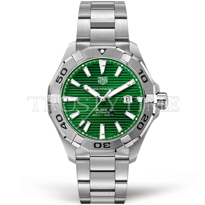 Часы Tag Heuer из коллекции Aquaracer Calibre 5. Классические мужские часы Tag Heuer Aquaracer Calibre 5 43mm WAY2015.BA0927 премиального качества (Артикул магазина: TG-0595) оснащены надежным автоматическим механизмом с автоподзаводом (работает от амплитуды движения руки) калибра Sellita SW200, в котором реализованы следующие функции: часовая, минутная и секундная стрелки, а так же дата. Круглый корпус часов стального цвета, имеющий размер 43 мм и высоту 13.5 мм превосходно дополнит образ и украсит запястье своего обладателя. Для изготовления часов Tag Heuer Aquaracer Calibre 5 43mm WAY2015.BA0927 предлагаемых в нашем интернет-магазине, применяются нержавеющая сталь 316L высокого качества (Швейцарский стандарт), а так же сапфировое стекло высокой прочности, благодаря чему обеспечивается максимальная защита от сколов и механических повреждений. Отличительной чертой данной модели является зеленый циферблат, часовые индексы которого обеспечивают часовые метки. Завершает образ браслет из нержавеющей стали стального цвета с фирменной раскладывающейся застежкой Tag Heuer. Водонепроницаемость данной модели составляет 30М (WR30) – допускается минимальное воздействие с водой.
