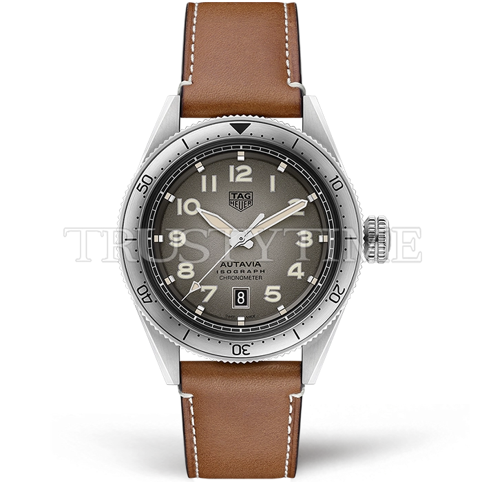 Часы Tag Heuer из коллекции Autavia. Спортивные мужские часы Tag Heuer Autavia Isograph Calibre 5 42mm WBE5111.FC8267 премиального качества (Артикул магазина: TG-0601) оснащены надежным автоматическим механизмом с автоподзаводом (работает от амплитуды движения руки) калибра Sellita SW200, в котором реализованы следующие функции: часовая, минутная и секундная стрелки, а так же дата. Круглый корпус часов стального цвета, имеющий размер 42 мм и высоту 13.5 мм превосходно дополнит образ и украсит запястье своего обладателя. Для изготовления часов Tag Heuer Autavia Isograph Calibre 5 42mm WBE5111.FC8267 предлагаемых в нашем интернет-магазине, применяются нержавеющая сталь 316L высокого качества (Швейцарский стандарт), а так же сапфировое стекло высокой прочности, благодаря чему обеспечивается максимальная защита от сколов и механических повреждений. Отличительной чертой данной модели является серый циферблат, часовые индексы которого обеспечивают арабские цифры. Завершает образ кожаный ремешок коричневого цвета с фирменной классической застежкой Tag Heuer. Водонепроницаемость данной модели составляет 30М (WR30) – допускается минимальное воздействие с водой.
