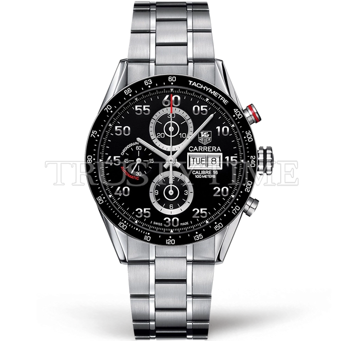 Часы Tag Heuer из коллекции Carrera Calibre 16. Спортивные мужские часы Tag Heuer Carrera Calibre 16 Day Date 43mm CV2A10.BA0796 премиального качества (Артикул магазина: TG-0561) оснащены надежным автоматическим механизмом с автоподзаводом (работает от амплитуды движения руки) калибра 1887, в котором реализованы следующие функции: часовая, минутная и секундная стрелки, а так же дата, день недели, хронограф. Круглый корпус часов стального цвета, имеющий размер 43 мм и высоту 17 мм превосходно дополнит образ и украсит запястье своего обладателя. Для изготовления часов Tag Heuer Carrera Calibre 16 Day Date 43mm CV2A10.BA0796 предлагаемых в нашем интернет-магазине, применяются нержавеющая сталь 316L высокого качества (Швейцарский стандарт), а так же сапфировое стекло высокой прочности, благодаря чему обеспечивается максимальная защита от сколов и механических повреждений. Отличительной чертой данной модели является черный циферблат, часовые индексы которого обеспечивают арабские цифры. Завершает образ браслет из нержавеющей стали стального цвета с фирменной раскладывающейся застежкой Tag Heuer. Водонепроницаемость данной модели составляет 30М (WR30) – допускается минимальное воздействие с водой.