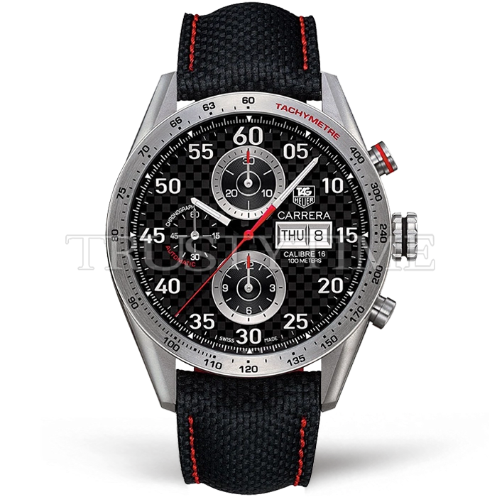 Часы Tag Heuer из коллекции Carrera Calibre 16. Спортивные мужские часы Tag Heuer Carrera Calibre 16 Day Date 43mm CV2A80.FC6256 премиального качества (Артикул магазина: TG-0277) оснащены надежным автоматическим механизмом с автоподзаводом (работает от амплитуды движения руки) калибра Valjoux-7750, в котором реализованы следующие функции: часовая, минутная и секундная стрелки, а так же дата, день недели, хронограф. Круглый корпус часов стального цвета, имеющий размер 43 мм и высоту 16 мм превосходно дополнит образ и украсит запястье своего обладателя. Для изготовления часов Tag Heuer Carrera Calibre 16 Day Date 43mm CV2A80.FC6256 предлагаемых в нашем интернет-магазине, применяются нержавеющая сталь 316L высокого качества (Швейцарский стандарт), а так же сапфировое стекло высокой прочности, благодаря чему обеспечивается максимальная защита от сколов и механических повреждений. Отличительной чертой данной модели является черный циферблат, часовые индексы которого обеспечивают арабские цифры, часовые индексы которого обеспечивают часовые метки. Завершает образ нейлоновый ремешок черного цвета с фирменной раскладывающейся застежкой Tag Heuer. Водонепроницаемость данной модели составляет 30М (WR30) – допускается минимальное воздействие с водой.
