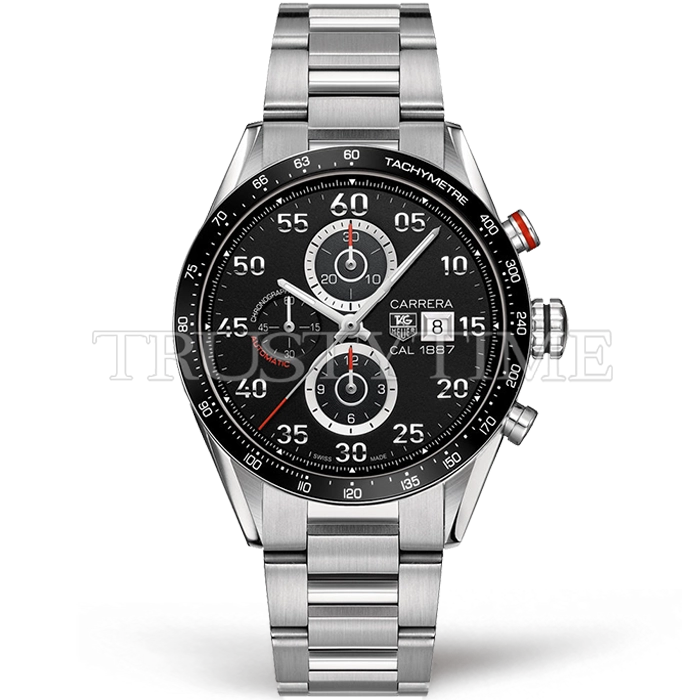 Часы Tag Heuer из коллекции Carrera Calibre 1887. Спортивные мужские часы Tag Heuer Carrera Calibre 1887 43mm CAR2A10.BAO799 премиального качества (Артикул магазина: TG-0417) оснащены надежным автоматическим механизмом с автоподзаводом (работает от амплитуды движения руки) калибра Valjoux-7750, в котором реализованы следующие функции: часовая, минутная и секундная стрелки, а так же хронограф, дата. Круглый корпус часов стального цвета, имеющий размер 43 мм и высоту 17 мм превосходно дополнит образ и украсит запястье своего обладателя. Для изготовления часов Tag Heuer Carrera Calibre 1887 43mm CAR2A10.BAO799 предлагаемых в нашем интернет-магазине, применяются нержавеющая сталь 316L высокого качества (Швейцарский стандарт), а так же сапфировое стекло высокой прочности, благодаря чему обеспечивается максимальная защита от сколов и механических повреждений. Отличительной чертой данной модели является черный циферблат, часовые индексы которого обеспечивают арабские цифры. Завершает образ браслет из нержавеющей стали стального цвета с фирменной раскладывающейся застежкой Tag Heuer. Водонепроницаемость данной модели составляет 30М (WR30) – допускается минимальное воздействие с водой.