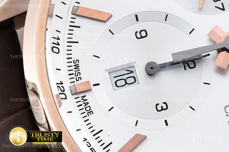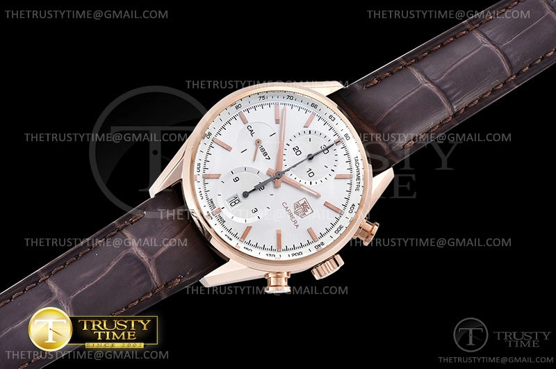 Часы Tag Heuer из коллекции Carrera Calibre 1887. Спортивные мужские часы Tag Heuer Carrera Calibre 1887 41mm CAR2140.FC8145 премиального качества (Артикул магазина: TG-0416) оснащены надежным автоматическим механизмом с автоподзаводом (работает от амплитуды движения руки) калибра Valjoux-7750, в котором реализованы следующие функции: часовая, минутная и секундная стрелки, а так же хронограф, дата. Круглый корпус часов розового цвета, имеющий размер 41 мм и высоту 17 мм превосходно дополнит образ и украсит запястье своего обладателя. Для изготовления часов Tag Heuer Carrera Calibre 1887 41mm CAR2140.FC8145 предлагаемых в нашем интернет-магазине, применяются нержавеющая сталь 316L высокого качества (Швейцарский стандарт), а так же сапфировое стекло высокой прочности, благодаря чему обеспечивается максимальная защита от сколов и механических повреждений. Отличительной чертой данной модели является серебристый циферблат, часовые индексы которого обеспечивают часовые метки. Завершает образ кожаный ремешок черного цвета с фирменной раскладывающейся застежкой Tag Heuer. Водонепроницаемость данной модели составляет 30М (WR30) – допускается минимальное воздействие с водой.