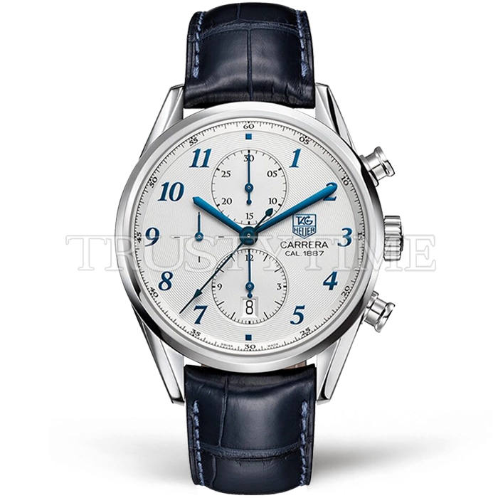 Часы Tag Heuer из коллекции Carrera Calibre 1887. Спортивные мужские часы Tag Heuer Carrera Calibre 1887 41mm CAR2114.FC6292 премиального качества (Артикул магазина: TG-0612) оснащены надежным автоматическим механизмом с автоподзаводом (работает от амплитуды движения руки) калибра Valjoux-7750, в котором реализованы следующие функции: часовая, минутная и секундная стрелки, а так же хронограф, дата. Круглый корпус часов стального цвета, имеющий размер 41 мм и высоту 16 мм превосходно дополнит образ и украсит запястье своего обладателя. Для изготовления часов Tag Heuer Carrera Calibre 1887 41mm CAR2114.FC6292 предлагаемых в нашем интернет-магазине, применяются нержавеющая сталь 316L высокого качества (Швейцарский стандарт), а так же сапфировое стекло высокой прочности, благодаря чему обеспечивается максимальная защита от сколов и механических повреждений. Отличительной чертой данной модели является белый циферблат, часовые индексы которого обеспечивают арабские цифры. Завершает образ кожаный ремешок синего цвета с фирменной раскладывающейся застежкой Tag Heuer. Водонепроницаемость данной модели составляет 30М (WR30) – допускается минимальное воздействие с водой.