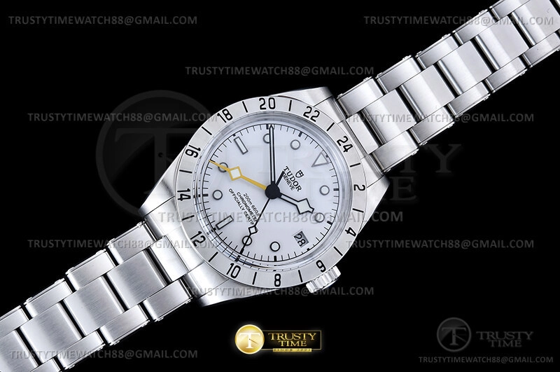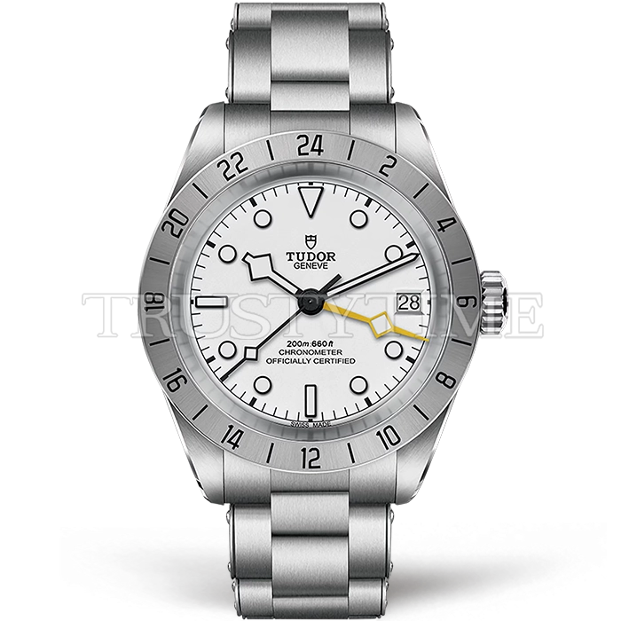 Часы Tudor из коллекции Black Bay GMT. Классические мужские часы Tudor Heritage Black Bay Pro GMT 39mm M79470-0004 премиального качества (Артикул магазина: TD-0861) оснащены надежным автоматическим механизмом с автоподзаводом (работает от амплитуды движения руки) калибра 3186, в котором реализованы следующие функции: часовая, минутная и секундная стрелки, а так же дата, двойное время (GMT). Круглый корпус часов стального цвета, имеющий размер 39 мм и высоту 15 мм превосходно дополнит образ и украсит запястье своего обладателя. Для изготовления часов Tudor Heritage Black Bay Pro GMT 39mm M79470-0004 предлагаемых в нашем интернет-магазине, применяются нержавеющая сталь 316L высокого качества (Швейцарский стандарт), а так же сапфировое стекло высокой прочности, благодаря чему обеспечивается максимальная защита от сколов и механических повреждений. Отличительной чертой данной модели является белый циферблат, часовые индексы которого обеспечивают часовые метки. Завершает образ браслет из нержавеющей стали стального цвета с фирменной раскладывающейся застежкой Tudor. Водонепроницаемость данной модели составляет 30М (WR30) – допускается минимальное воздействие с водой.