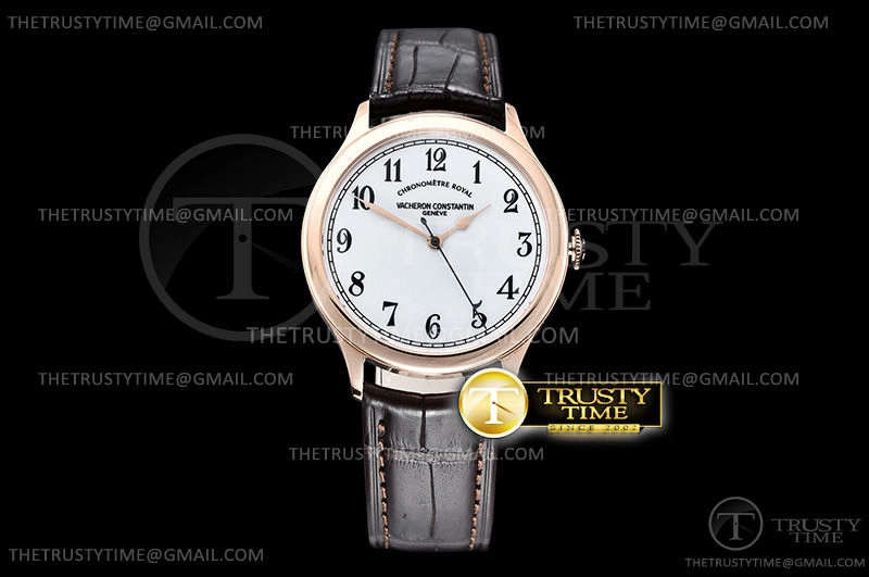 Часы Vacheron Constantin из коллекции Historiques. Классические мужские часы Vacheron Constantin Historiques Chronomètre Royal 1907 39mm 86122/000R-9362 премиального качества (Артикул магазина: VC-0130) оснащены надежным автоматическим механизмом с автоподзаводом (работает от амплитуды движения руки) калибра VC 2460SCC, в котором реализованы следующие функции: часовая, минутная и секундная стрелки, а так же максимально простой функционал без усложнений. Круглый корпус часов розового цвета, имеющий размер 39 мм и высоту 10 мм превосходно дополнит образ и украсит запястье своего обладателя. Для изготовления часов Vacheron Constantin Historiques Chronomètre Royal 1907 39mm 86122/000R-9362 предлагаемых в нашем интернет-магазине, применяются нержавеющая сталь 316F высокого качества (Швейцарский стандарт), а так же сапфировое стекло высокой прочности, благодаря чему обеспечивается максимальная защита от сколов и механических повреждений. Отличительной чертой данной модели является белый циферблат, часовые индексы которого обеспечивают арабские цифры. Завершает образ кожаный ремешок коричневого цвета с фирменной классической застежкой Vacheron Constantin. Водонепроницаемость данной модели составляет 30М (WR30) – допускается минимальное воздействие с водой.
