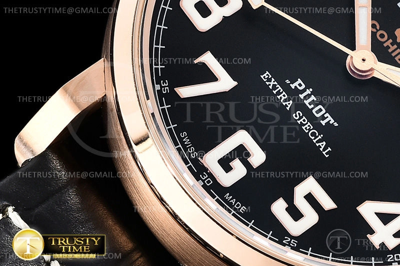Часы Zenith из коллекции Pilot. Классические мужские часы Zenith Pilot Type 20 Cohiba Edition 45mm 18.2430.679/27.C721 премиального качества (Артикул магазина: ZN-0292) оснащены надежным автоматическим механизмом с автоподзаводом (работает от амплитуды движения руки) калибра MY8215, в котором реализованы следующие функции: часовая, минутная и секундная стрелки, а так же максимально простой функционал без усложнений. Круглый корпус часов розового цвета, имеющий размер 45 мм и высоту 13 мм превосходно дополнит образ и украсит запястье своего обладателя. Для изготовления часов Zenith Pilot Type 20 Cohiba Edition 45mm 18.2430.679/27.C721 предлагаемых в нашем интернет-магазине, применяются нержавеющая сталь 316L высокого качества (Швейцарский стандарт), а так же сапфировое стекло высокой прочности, благодаря чему обеспечивается максимальная защита от сколов и механических повреждений. Отличительной чертой данной модели является черный циферблат, часовые индексы которого обеспечивают арабские цифры. Завершает образ кожаный ремешок коричневого цвета с фирменной классической застежкой Zenith. Водонепроницаемость данной модели составляет 30М (WR30) – допускается минимальное воздействие с водой.