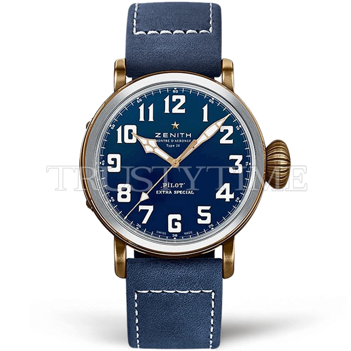 Часы Zenith из коллекции Pilot. Классические мужские часы Zenith Pilot Type 20 Extra Special 45mm 29.2430.679/57.C808 премиального качества (Артикул магазина: ZN-0331) оснащены надежным автоматическим механизмом с автоподзаводом (работает от амплитуды движения руки) калибра MY9015, в котором реализованы следующие функции: часовая, минутная и секундная стрелки, а так же максимально простой функционал без усложнений. Круглый корпус часов бронзового цвета, имеющий размер 45 мм и высоту 11.5 мм превосходно дополнит образ и украсит запястье своего обладателя. Для изготовления часов Zenith Pilot Type 20 Extra Special 45mm 29.2430.679/57.C808 предлагаемых в нашем интернет-магазине, применяются бронза высокого качества (Швейцарский стандарт), а так же сапфировое стекло высокой прочности, благодаря чему обеспечивается максимальная защита от сколов и механических повреждений. Отличительной чертой данной модели является синий циферблат, часовые индексы которого обеспечивают арабские цифры. Завершает образ кожаный ремешок синего цвета с фирменной классической застежкой Zenith. Водонепроницаемость данной модели составляет 30М (WR30) – допускается минимальное воздействие с водой.