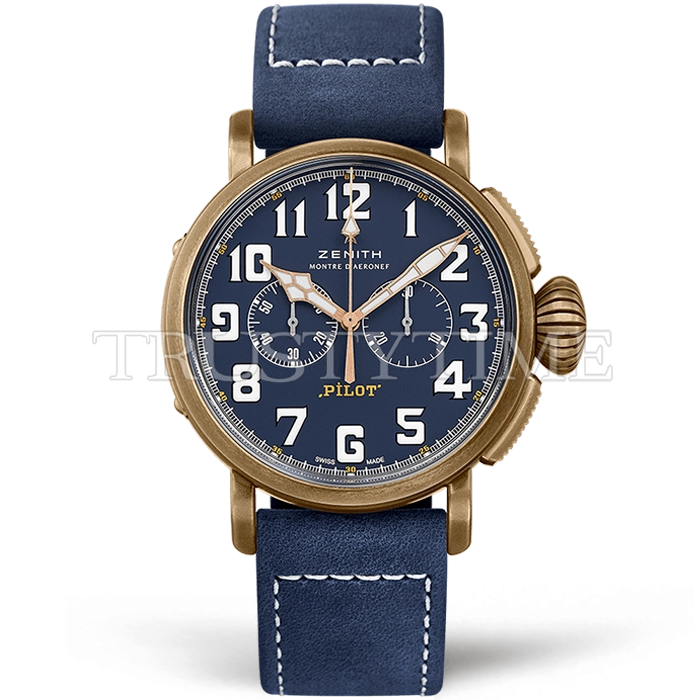 Часы Zenith из коллекции Pilot Chronograph. Спортивные мужские часы Zenith Pilot Type 20 Extra Special Chronograph 45mm 29.2430.4069/57.C808 премиального качества (Артикул магазина: ZN-0332) оснащены надежным автоматическим механизмом с автоподзаводом (работает от амплитуды движения руки) калибра Valjoux-7750, в котором реализованы следующие функции: часовая, минутная и секундная стрелки, а так же хронограф. Круглый корпус часов бронзового цвета, имеющий размер 45 мм и высоту 14.5 мм превосходно дополнит образ и украсит запястье своего обладателя. Для изготовления часов Zenith Pilot Type 20 Extra Special Chronograph 45mm 29.2430.4069/57.C808 предлагаемых в нашем интернет-магазине, применяются бронза высокого качества (Швейцарский стандарт), а так же сапфировое стекло высокой прочности, благодаря чему обеспечивается максимальная защита от сколов и механических повреждений. Отличительной чертой данной модели является синий циферблат, часовые индексы которого обеспечивают арабские цифры. Завершает образ кожаный ремешок синего цвета с фирменной классической застежкой Zenith. Водонепроницаемость данной модели составляет 30М (WR30) – допускается минимальное воздействие с водой.